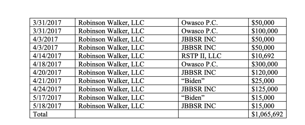 Some of these instances have been confirmed through bank records. For example, after a Chinese company wired Robinson Walker, LLC $3 million, the Biden family received approximately $1,065,692 over a three-month period in different bank accounts.